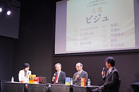 12月3日、三省堂が都内でイベント「国語辞典ナイト」を行い、「辞書を編む人が選ぶ 今年の新語2025」のベスト10と選外3語を発表した。1位は「ビジュ」、2位以下は「オールドメディア」「えっほえっほ」「しゃばい」「権力勾配」「男消し」「共連れ」「体験格差」「夏詣」「緊急銃猟」。